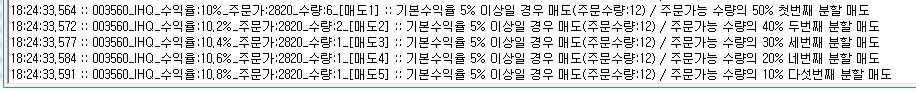 이후 보전율이 8%가 되면 매도 잔량의 50% 매도 주문 후 9999초동안 매도주문 유지하며 기존 9%일때 나갔던 50%의 주문은 취소(매도주문:25주, 취소주문:50주, 이후잔량 75주)