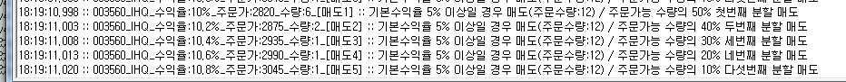 - 종목의 상한가가 2820원이고 해당 종목이 개장하자마자 상한가에 도달하여 분할매도 조건이 되었으나 주문 시 분할매도 조건에 의해 상한가 초과금액이 입력되어 매도가 안 되는 현상.