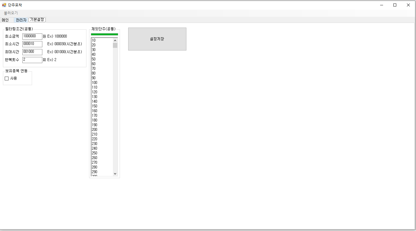 2번 항목은 기본 설정에서 제외단주로 지정된 단주, 최소금액이상 단주, 최소시간 이하, 최대시간 이상 단주들에 대해 포착하여 정리합니다.