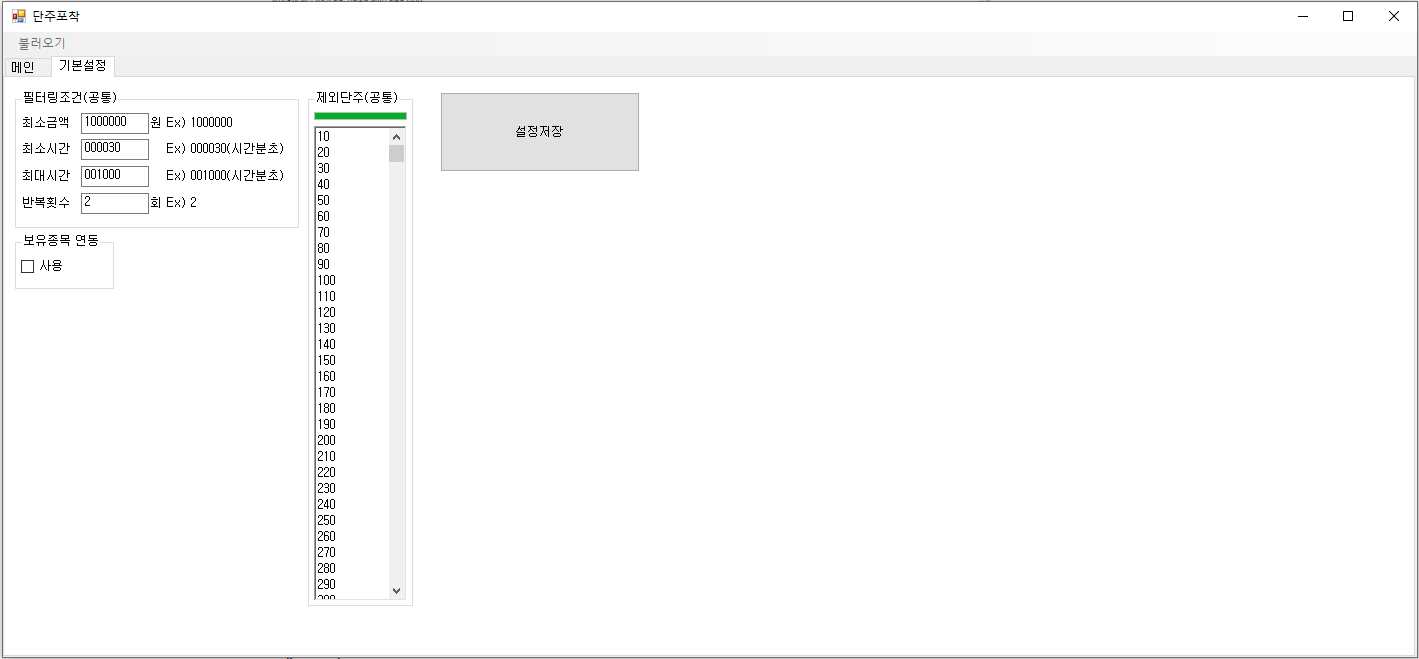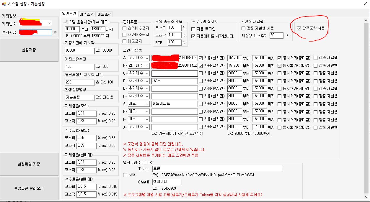1. 시스템 설정의 일반조건 탭에서 단주포착 사용여부 체크 |