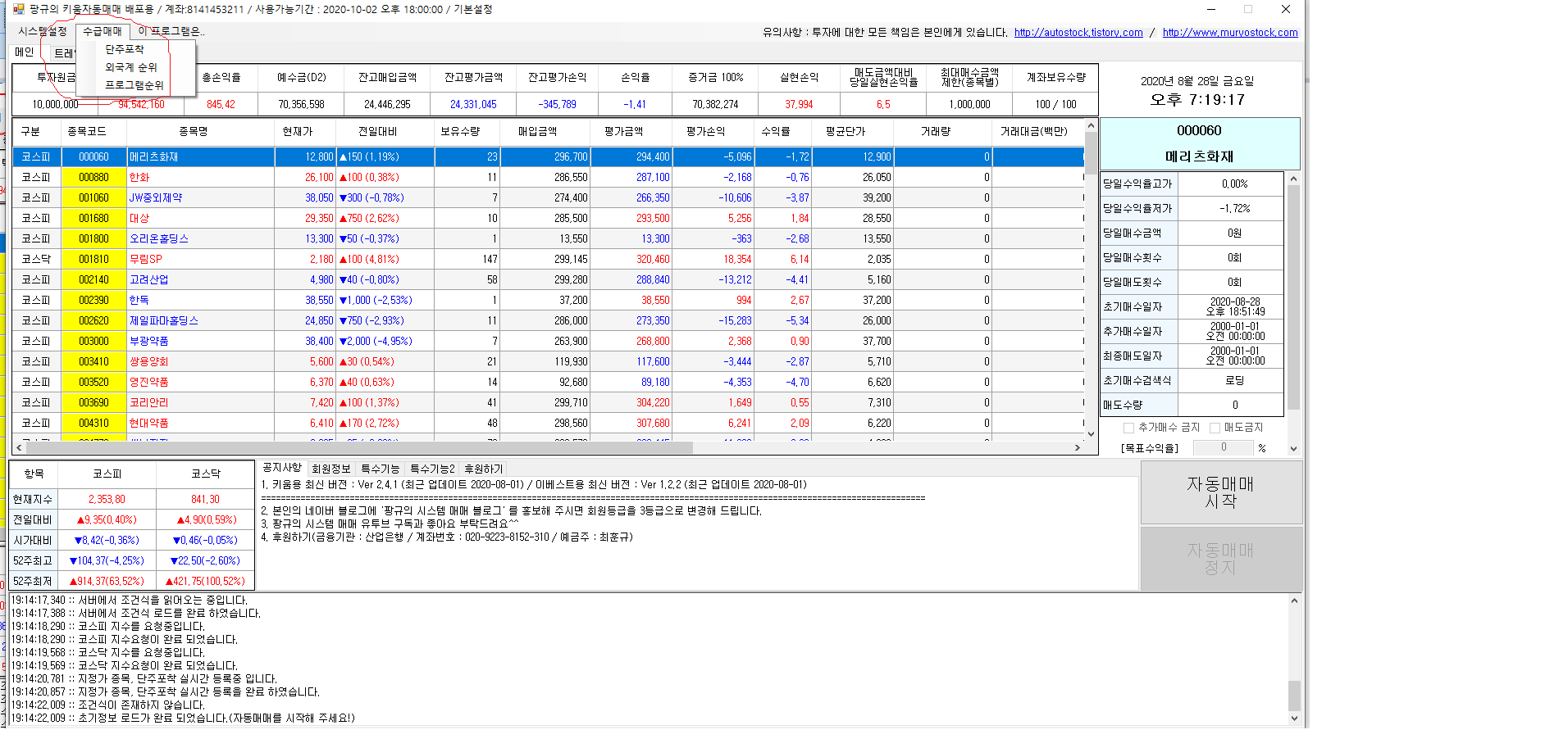 | 키움 자동매매 프로그램 Ver 2.4.1 업데이트 내역(단주포착 베타) (29) | 2020.08.28 |